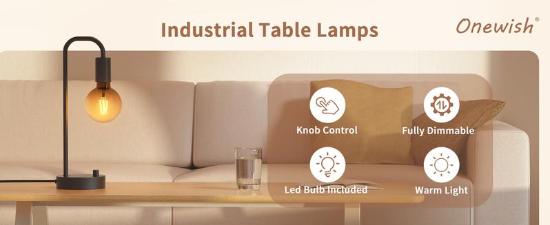 ONEWISH Industrial Table Lamp for Bedroom, Fully Dimmable Modern Bedside Lamps with 2700K Warm Light Bulb for Kids Reading, Minimalist Nightstand Lamp - Colour: back_2packs(Non-USB)