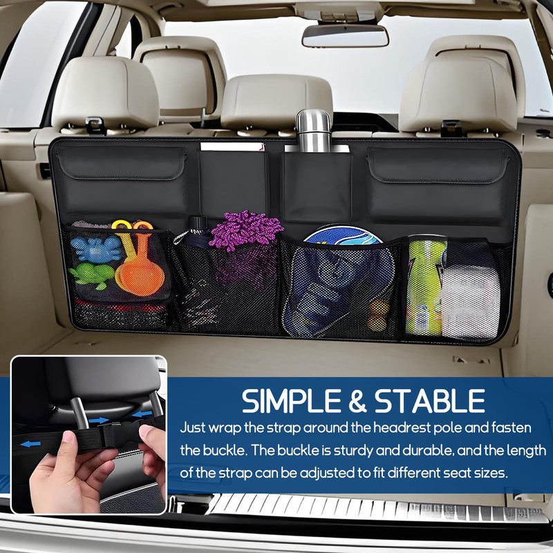 • 【Simple & Stable】: It is easy to install - just wrap the strap around the headrest bars and fasten the buckle. The buckle is sturdy, and the strap is adjustable in length to fit different seat sizes. There are also 3 hook and loop fasteners on the back of the organizer; the double-secure structure keeps it firmly in place without shaking or slipping.
