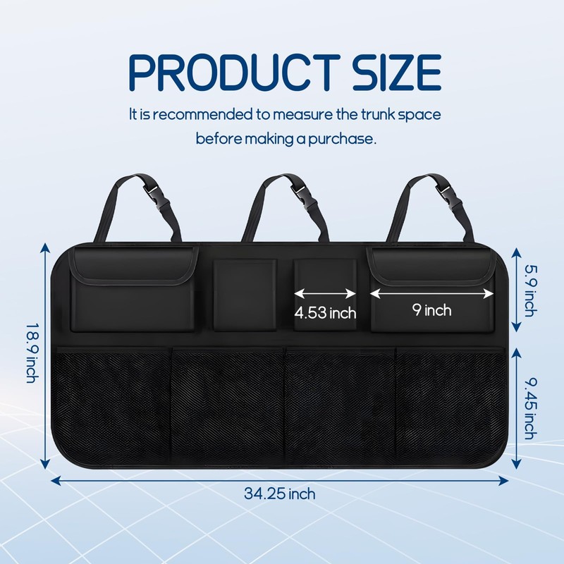 • 【Size & Application】: This trunk organizer is suitable for cars, SUVs, MPVs, vans and other vehicles, the hanging installation saves trunk floor space. The total sizes of the regular and upgraded styles are (L × H) 35.23×14.17 inches and 34.25×18.9 inches respectively. It is recommended to measure the trunk space before purchase.