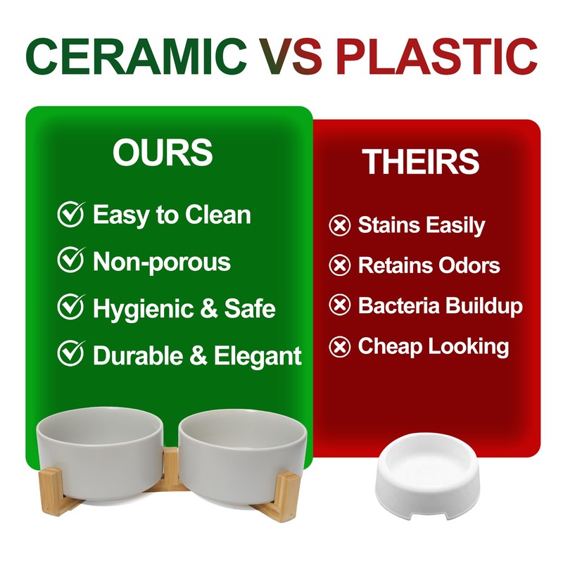 - Beats Plastic & Stainless Steel Bowls - Dog bowls ceramic won't scratch like stainless steel and maintains its smooth surface better than plastic bowls. Our wooden stand of ceramic dog food bowls includes upgraded anti-slip base on all contact points. Even the most enthusiastic Golden Retriever can't budge this feeding station. Finally, a bowl that stays put during mealtime!