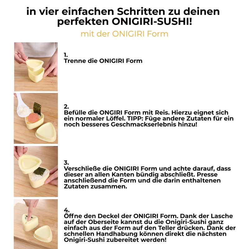 - Perfect Sushi for home – Do you also like to enjoy a delicious sushi menu and have always wanted to prepare something comparable at home? Then we have just the thing for you! Thanks to the onigiri mould, you can serve perfect onigiri sushi in seconds. Your guests will love it!
