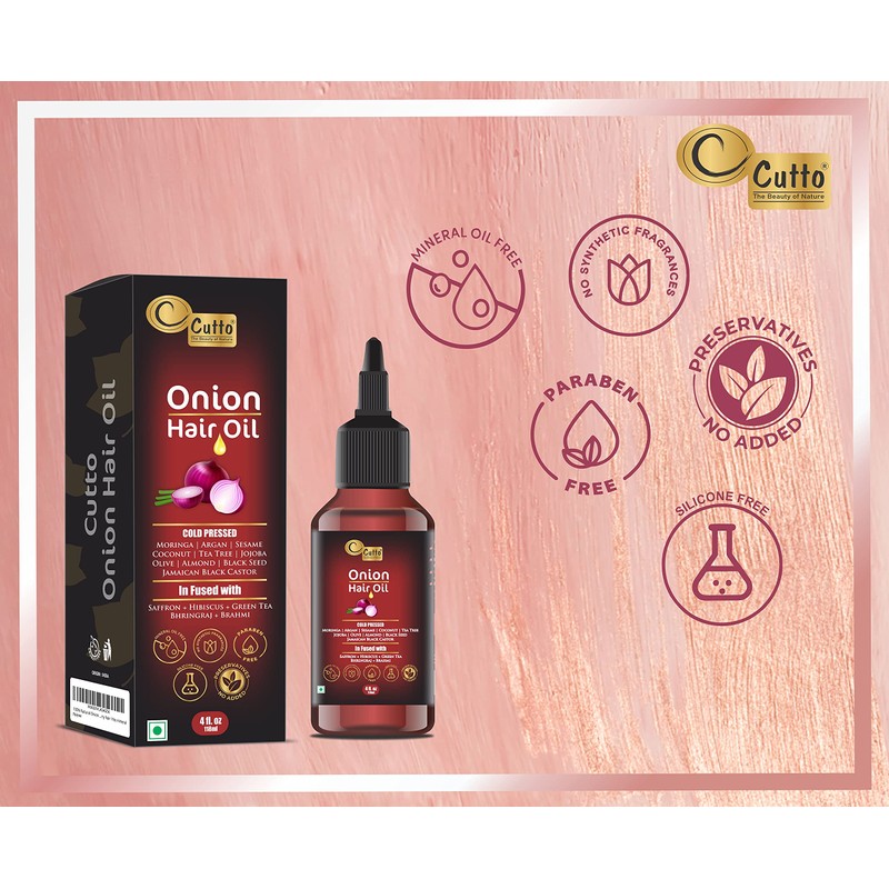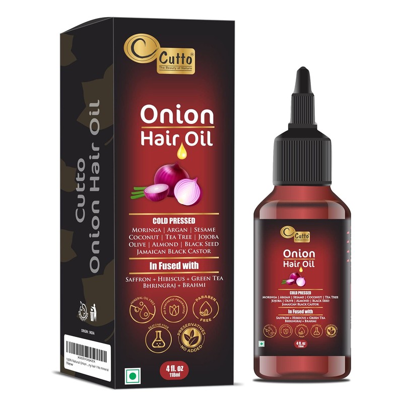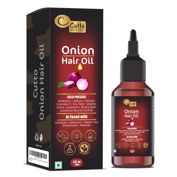 - CUTTO'S Onion Hair oil is enriched with a blend of 15 oils and extracts oil which supports healthy hair, controls dandruff, reduce hair loss and supports long, lustrous, shiny hair.