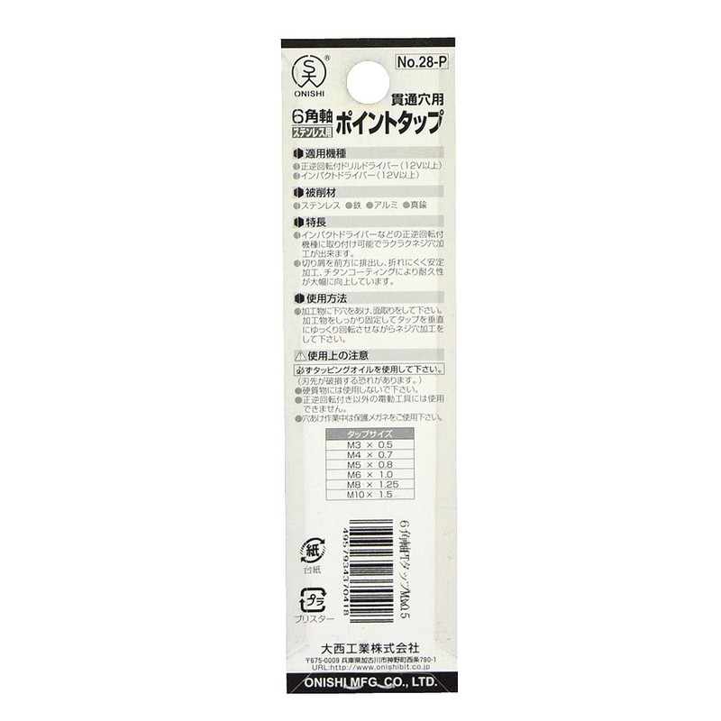 Onishi Kogyo Hexagonal Shaft Point Tap, M3 x 0.5