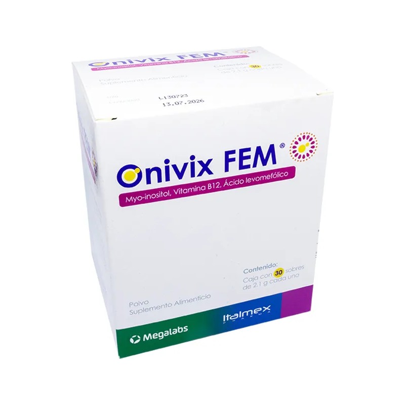 Descubre el equilibrio y bienestar que tu cuerpo merece con Onivix Fem, un suplemento alimenticio diseñado específicamente para la mujer moderna. Cada sobre de Onivix Fem contiene 2.1 g de una fórmula avanzada rica en Myo-inositol, Vitamina B12 y ácido levomefólico, ingredientes clave para apoyar tu nutrición diaria y contribuir a un estilo de vida saludable.