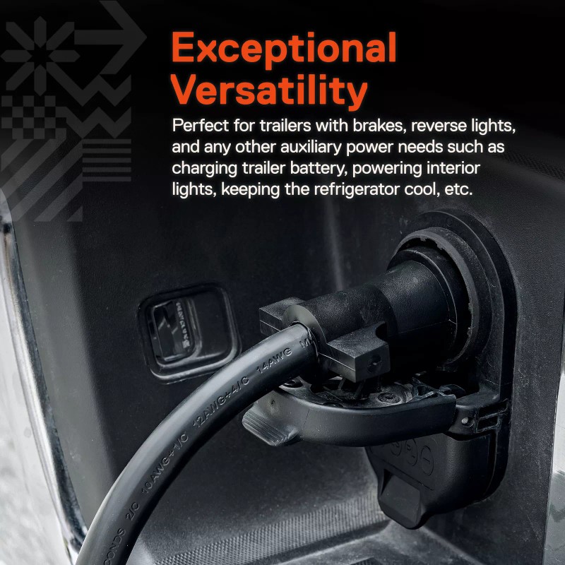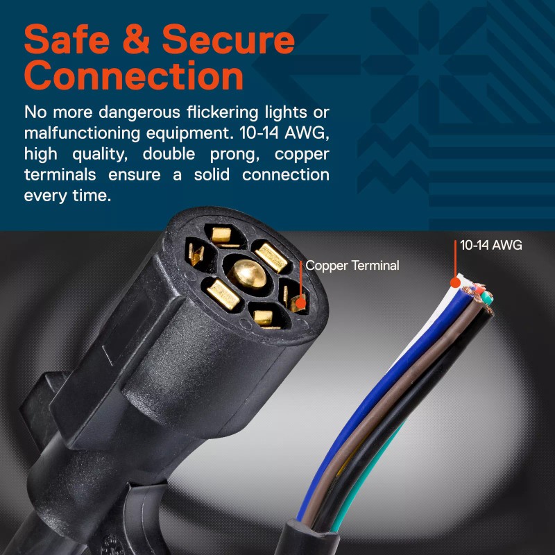 Manufactured to excel. This cable is made from the highest quality materials and is perfect for your RV, horse trailer, or food truck. Fully insulated, 10 to 14-gauge copper wires provide durability, longevity and safety. Pure copper terminals ensure excellent conductivity. The rugged, fully molded PVC casing is weatherproof, corrosion resistant, and prevents wear and abrasion failures.
