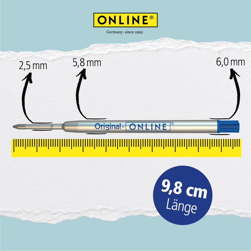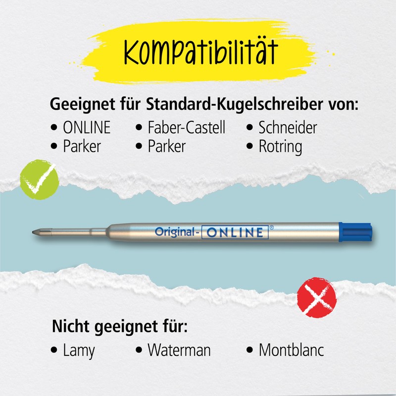 - FÜR DEN LIEBLINGS KULI: Den Lieblings-Kugelschreiber einfach immer weiter verwenden mit den praktischen Kuliminen von Online. Die internationale Standard Großraumminen passen in alle gängigen Großraum Kugelschreiber-Modelle.