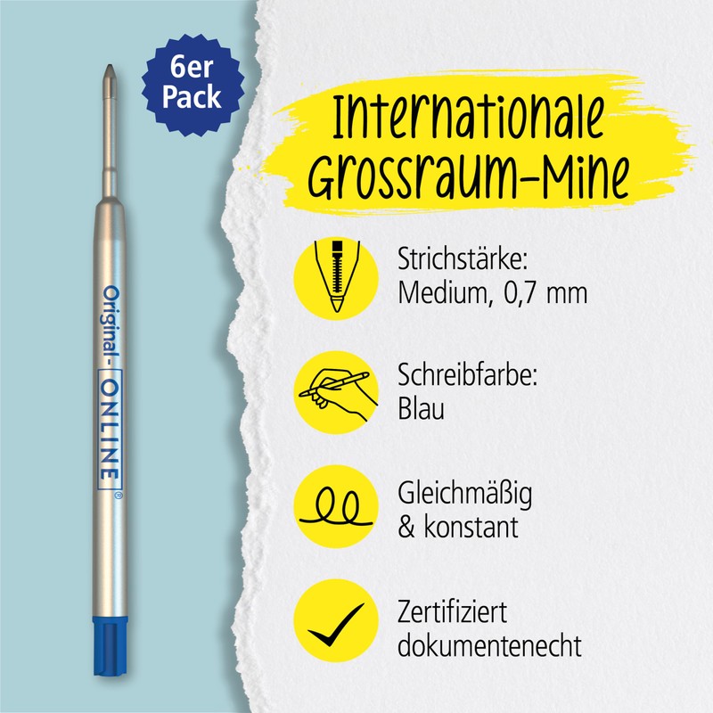 Online writing instruments, 6 ballpoint pen refills, blue, G2 format, line width M, (Swiss-made, suitable for: Parker, Pelikan, Faber-Castell etc., extremely high quality and durable, standard