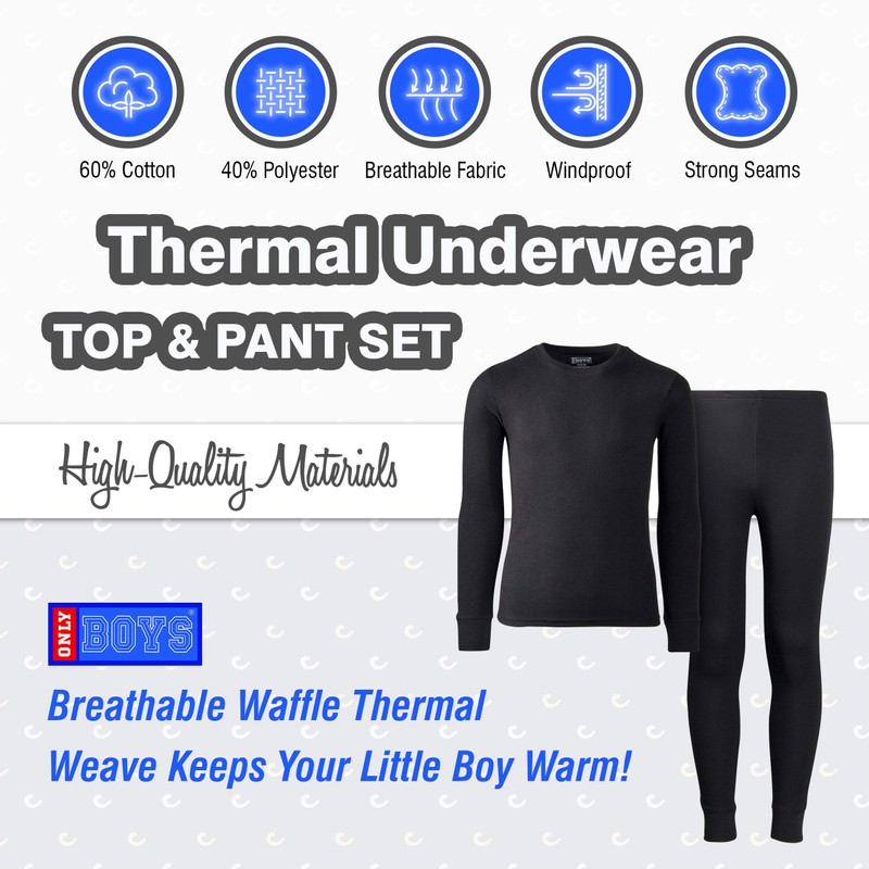 - HIGH QUALITY: Our thermal underwear set for toddler and older boys includes a long-sleeve t-shirt and a pair of matching sweatpants; Extra warm waffle-knit underwear set for your son, perfect for layering, bedtime, sleepovers, and relaxing; Ideal for staying cozy on winter days