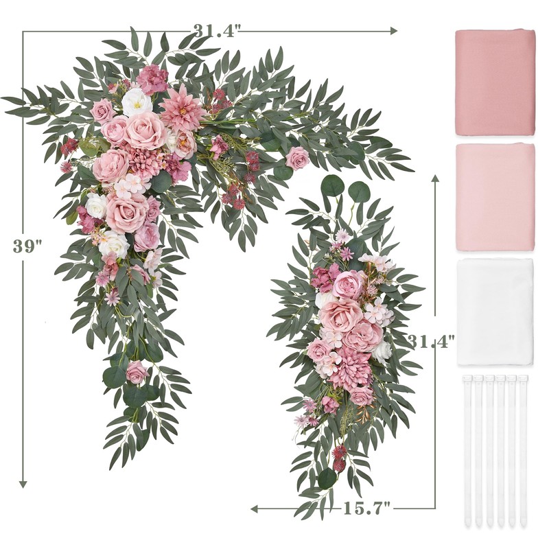 - PACKAGE AND SIZE: Wedding arch flowers include one pink theme big corner flower (39.37"L x 31.49"W) + one pink theme small corner flower (31.49"L x 15.74"W) + 3* curtains (31.5"L x 29.5"W) + 6* white zipper ties (17.7"L). (Note: wooden frame not included)