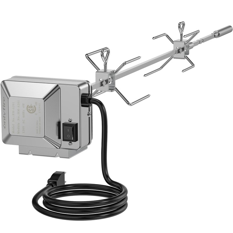 - 【Package include】The rotisserie kit includes stainless steel 5/16" square spit rod, 4-prong stainless steel meat forks, motor bracket, rod handle, installation hardware and a heavy-duty 110v electric motor with 36" cable.
