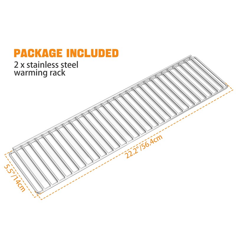 • Demensions: Each warming rack measures 22.2”L x 5.5”W x 1”H, and the package includes two warming racks.
