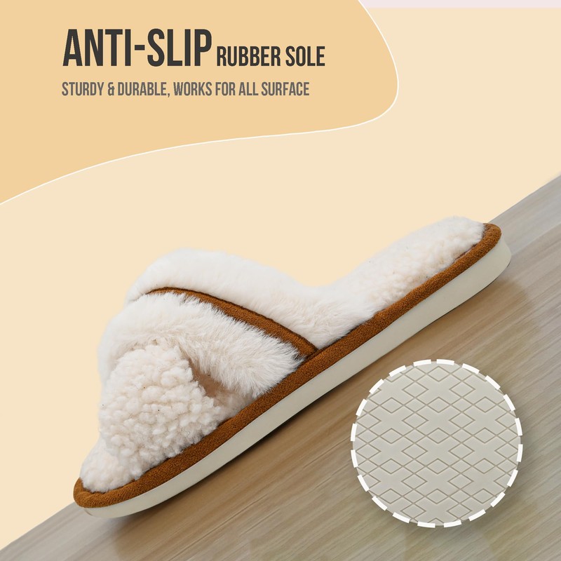 Onmygogo Fuzzy Cross Band Indoor Slippers for Women, Open Toe Slippers with Memory Foam and Soft Nonslip Sole(6.5-7.5, beige)