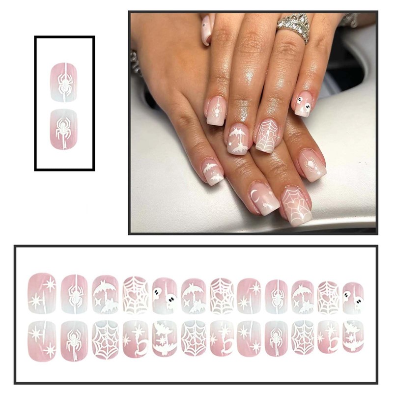 ONPRESS 24Pcs Halloween Press on Nails Short Square Fake Nails White Spider Web Ghost Acrylic False Nails Cute Moon Bat Full Cover Glue on Nails Pink Nude Reusable Glossy Stick on Nail for Women