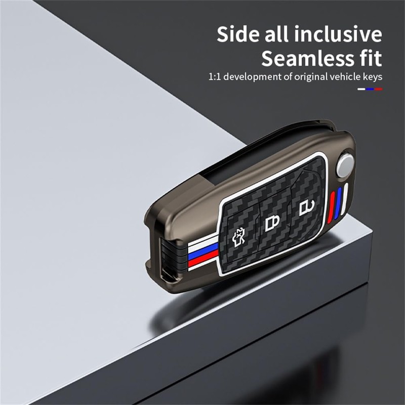 • Material Construction:Our car key case is crafted from a combination of durable metal(outer shell) and soft silicone(inner case). The metal shell offers excellent protection against impacts, while the silicone provides a comfortable grip and added shock absorption.Provide double protection for your key fob.Boasting a trendy carbon fiber pattern, this key case elevates the look of your car key. It adds a sporty and sophisticated touch, making it a stylish accessory for vehicle owner