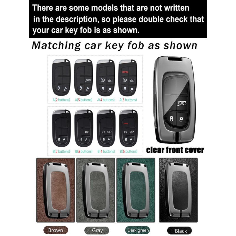 - Fits Models:key fob case compatible with Jeep Grand Cherokee / fit for Dodge Challenger Charger Dart Durango Journey / fit for Chrysler 200 300 / fit for Fiat Freemont Ottimo Viaggio etc.(Clear front cover for 2/3/4/5 buttons)*NOTE*--Please refer to the matching keys shown on the picture.Because of the different years even if the same car model,the key fob may also be different