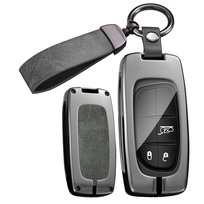 ontto Car Key Case Fit for Chrysler 200 300,Key Fob Shell with Clear Front Cover,with Keychain,Metal and Leather Key Protector Fit for Fiat Freemont Ottimo Viaggio,Grey