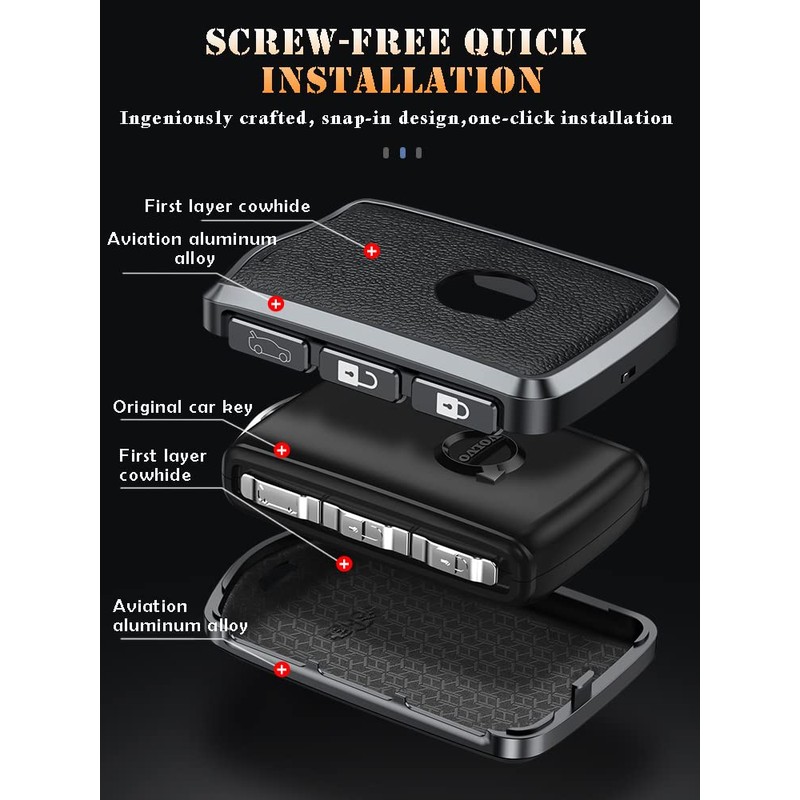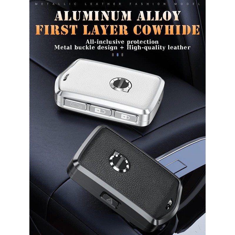 - Material: the car key holder is made of high-quality aluminium alloy + selected first layer cowhide leather, double layer materials, 360° protects your car key from damage. Make your car keys look beautiful and stylish.