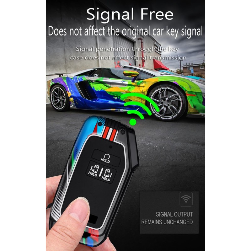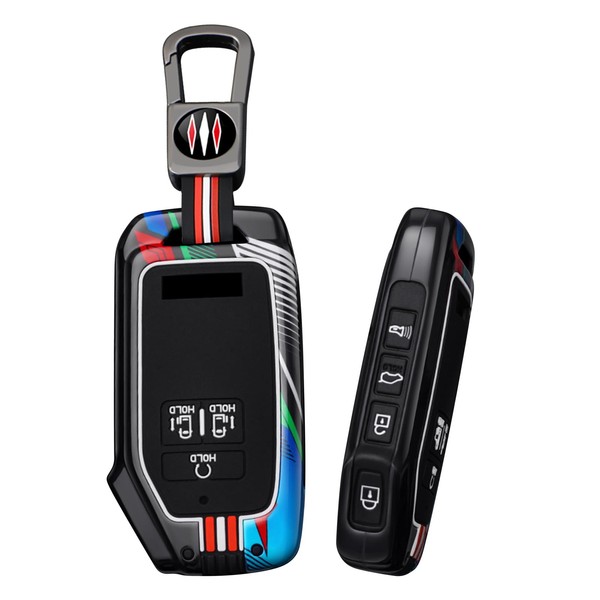 • 【UNIQUE DESIGN AND CRAFTSMANSHIP】This car key fob cover itself is a piece of art! It's made of electro-galvanized alloy which makes the touching of the shell smooth and classy. The central silicone all-inclusive button cover can protect from scratch and wear-out for your key. The appearance design of this product is inspired by sports racing, using Water Sticker Craft Process, Graphic and color design highlights your personality, sports and fashion.