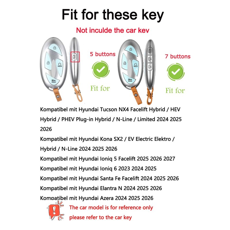 - Kompatibilit?t: Dieses Schlsseletui aus Leder und Metall passt fr Hyundai Grandeur Grand Prix GN7 Ioniq 6 Kona EV SE Azera Tucson Santa Fe Hybrid Elantra 2023 2024 2025 5/7 Tasten. (Aufgrund unterschiedlicher Produktionsjahre k?nnen die Autoschlssel unterschiedlich sein. Bitte beachten Sie den passenden Autoschlssel in Bild 2.)