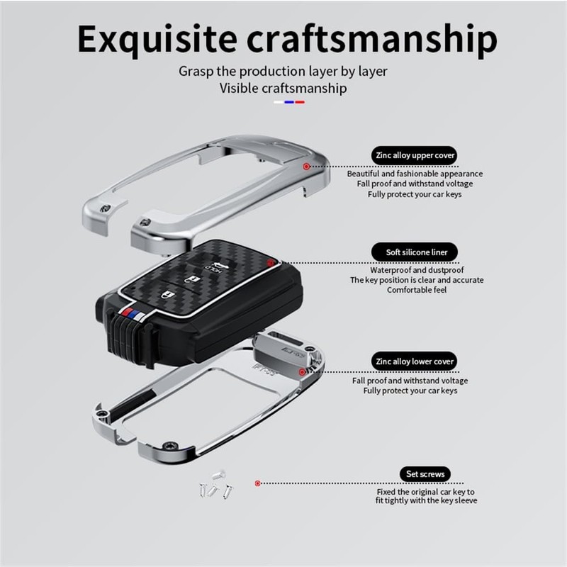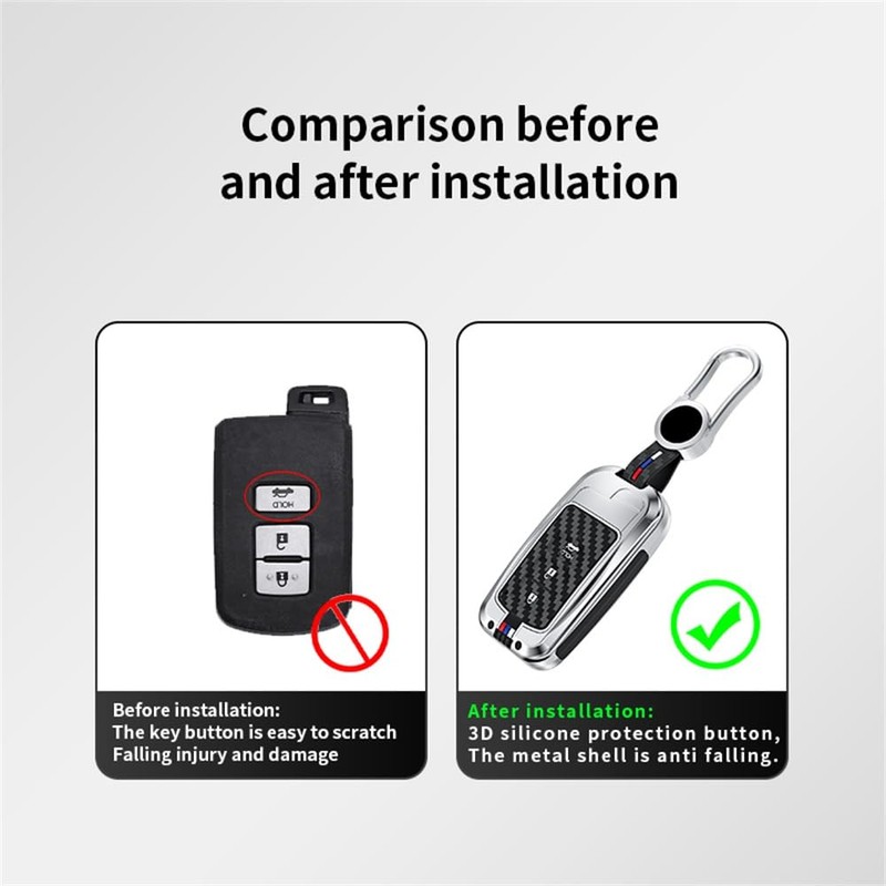 • Material Construction:Our car key case is crafted from a combination of durable metal(outer shell) and soft silicone(inner case). The metal shell offers excellent protection against impacts, while the silicone provides a comfortable grip and added shock absorption.Provide double protection for your key fob.Boasting a trendy carbon fiber pattern, this key case elevates the look of your car key. It adds a sporty and sophisticated touch, making it a stylish accessory for vehicle owner