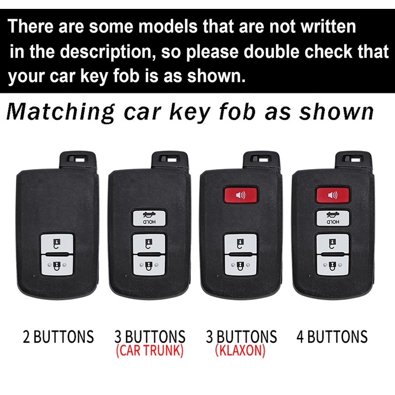 • Fits Models : This key cover compatible with RAV4 Highlander Avalon Sequoia Tundra Tacoma 4Runner Cruise Prius Corolla 2012-up etc.(for 2/3/4 buttons key fob)*NOTE*--Please refer to the matching keys shown on the picture.Because of the different years even if the same car model,the key fob may also be different