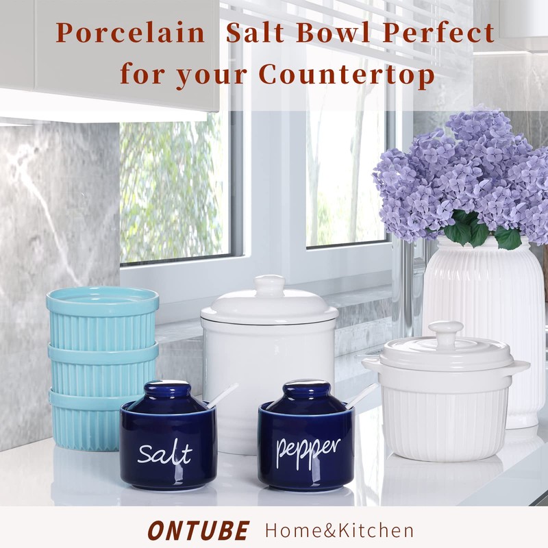 ONTUBE Farmhouse 8oz Pepper and Salt Bowls with Lid and Spoon, Ceramics Condiment Pots,Seasoning Jar Spice Container for Kitchen,Dishwasher Safe (Navy)
