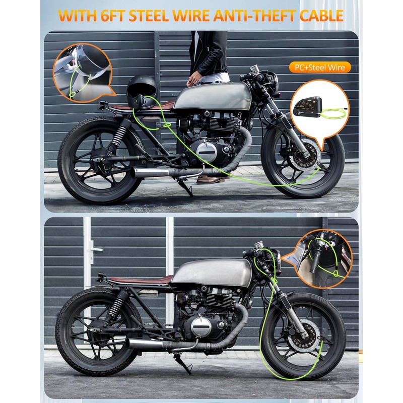 • HEAVY DUTY MOTORCYCLE LOCKS & 6FT ANTI-THEFT CABLE: The internal anti-theft cable is made from high tensile steel wire, which is more wear-resistant than traditional reminder cables. Use the anti-theft cable to lock the motorcycle wheel/electric bike/motorcycle helmet to the vehicle after parking, providing all-around security protection. The bright of the anti-theft cable reminds the rider to unlock the vehicle before riding. Essential motorcycle accessories