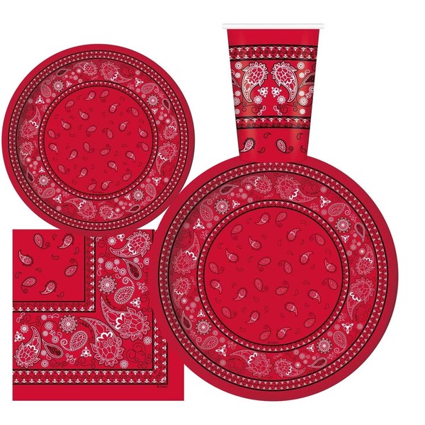 Oojami Serves 24 Complete Party Pack Red Bandana Western Party Supplies 9" Dinner Paper Plates 7" Dessert Paper Plates 12 oz Cups 3 Ply Napkins Red Bandana Western Birthday Party Supplies
