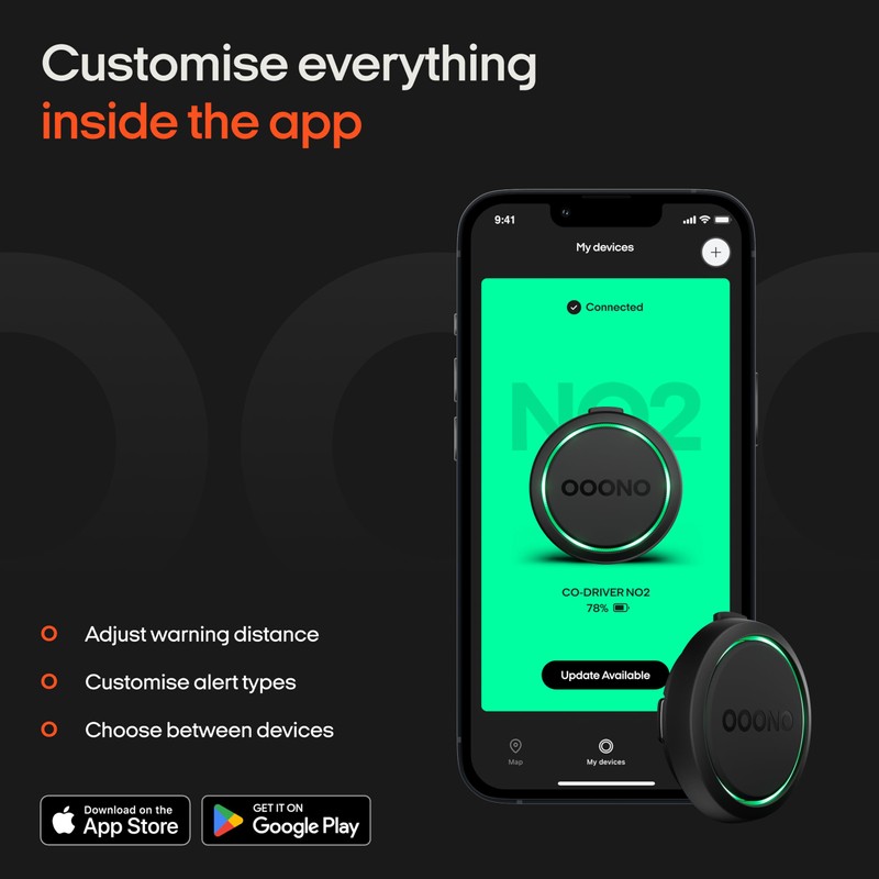 - APPLE CARPLAY/ANDROID AUTO + NAVIGATION: Get your OOONO warnings directly on your infotainment system. The CO-DRIVER NO2 is Apple CarPlay/Android Auto compatible and has a navigation feature.
