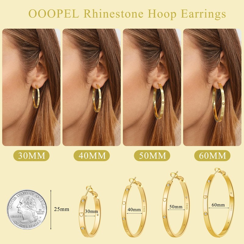 - Big Hoop Earrings for Women: These large gold hoop earrings are 4mm wide and 30/40/50/60mm diameter available. Different sizes are available for everyday needs. The gold earrings hoops are durable and lightweight, so you won't feel uncomfortable wearing them for a long time. 925 Sterling Silver pin closure and elasticized clasp for the most comfortable wearing experience.