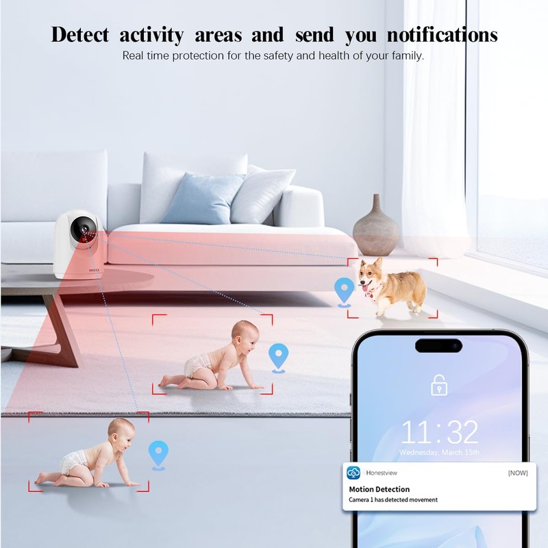 - {Motion Detection & Alarm Push} The motion Detection feature allows security cameras to accurately detect and automatically track objects over a wide area. The baby monitor camera includes human tracking intelligence. Once enabled, the indoor home cameras will automatically record and follow any moving object, issuing an "alarm" when necessary.