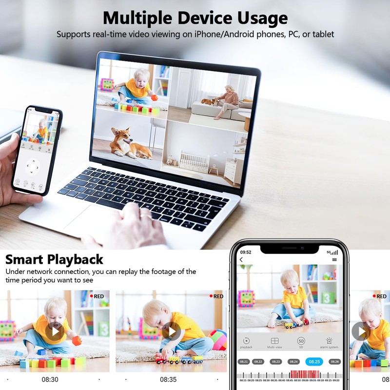 - {2.7K 1944P High-definition} The wireless camera indoor supports cloud storage and local TF card video storage to ensure safe storage of video data. The mini camera wireless has 2592*1944 high resolution, images are clear and fine.The wireless security camera system with 6 infrared lights, night irradiation distance can reach 16 Feet. Even at night, it can effectively monitor house security.