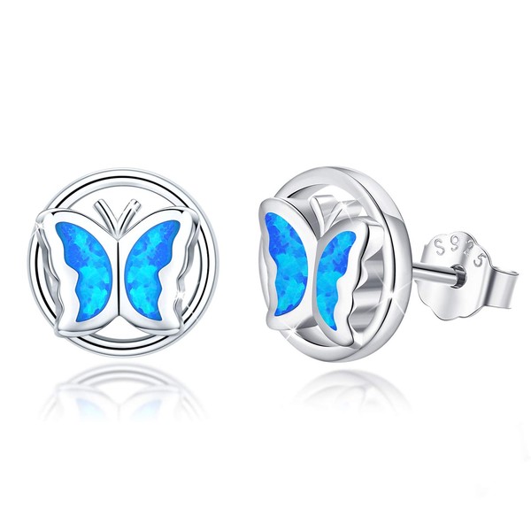 Opal Butterfly Earrings for Women S925 Sterling Silver Blue Butterfly Circle Stud Earring Birthday Valentine's Day Jewelry Gifts for Girls, Sterling Silver, blue opal
