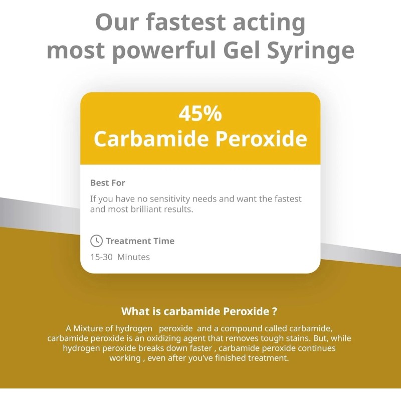 - 20% Gel Syringes is the best option for user who want are somewhat sensitive teeth but are also interested in maximizing whitening results.