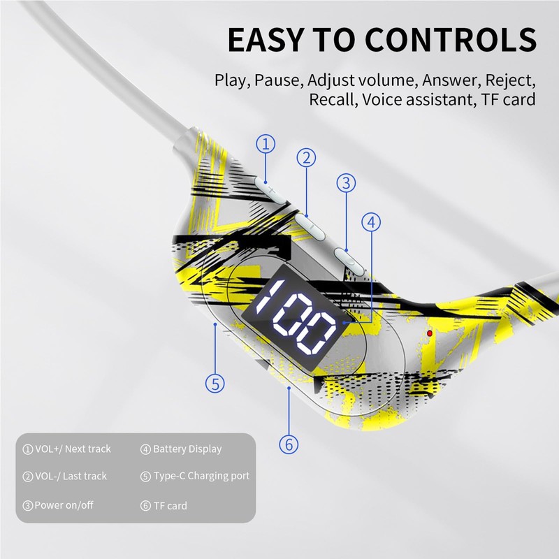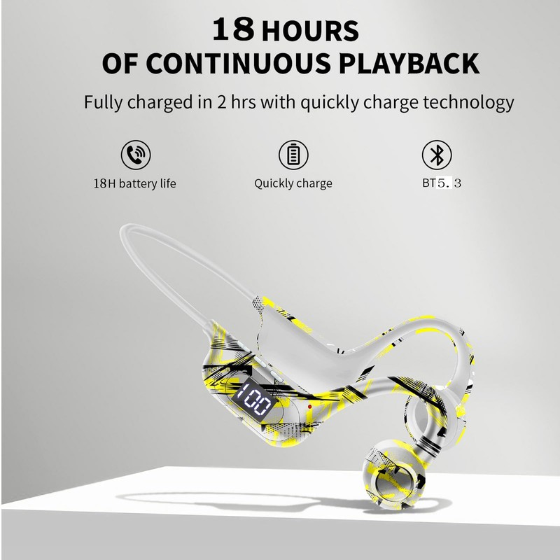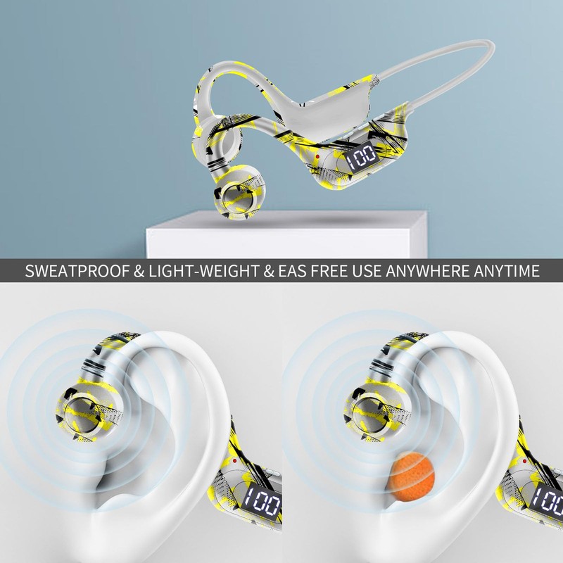 Open Doodle Bone Conduction Wireless Bluetooth Headset, 5.3 Card Digital Display Hanging Ear Sports Bluetooth Headset, Suitable for Mobile Phones and Computers, Outdoor Sports, Travel, Driving(Yellow)