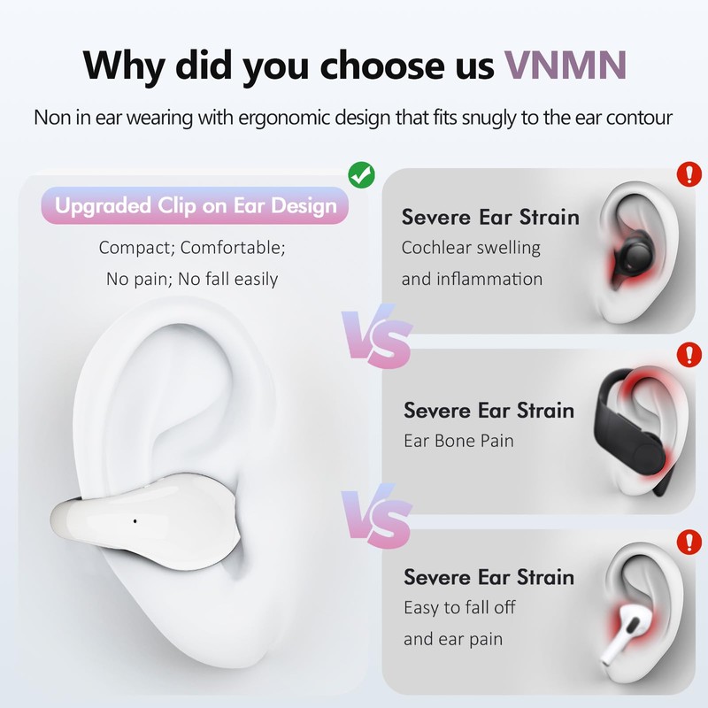 - Bone Conduction Headphones — Newly developed open ear air conduction heaphones to make sure you can sense the sound from the external environment when you are enjoying music, calling or sports, ensured your personal safety and be able to respond politely to others while walking or running in the streets. Ear clip wearing keeps your ears' canal clean and protect eardrum from damage, providing more heathy listening.