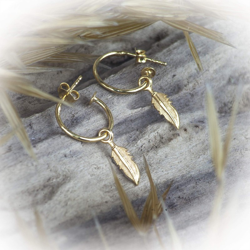 Open Hoop Earrings & Feather Charms in 18-Carat Gold Vermeil over 925 Sterling Silver with Butterfly Fastening, Hypoallergenic, Suitable for Women and Men