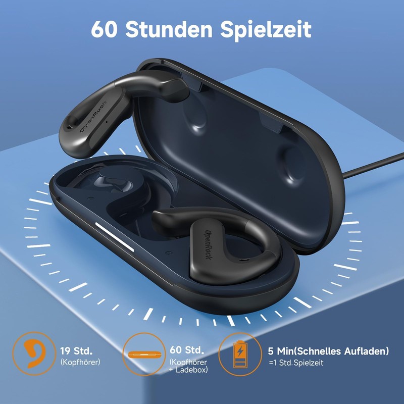 - 60 hours playback time: the charging box supplied with OpenRock S has a capacity of 750 mAh. The powerful battery supports up to 19 hours of continuous playback at 70% volume. The long battery life allows you to listen to music continuously. With the charging box, the earbuds can be used continuously for 41 hours. OpenRock S offers a total of 60 hours of playback time on just one charge. Supports fast charging, 5 minutes charging = 1 hour of use.