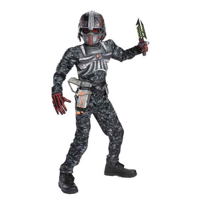 - Jumpsuit with muscle torso, gloves, face mask with helmet, and goggles