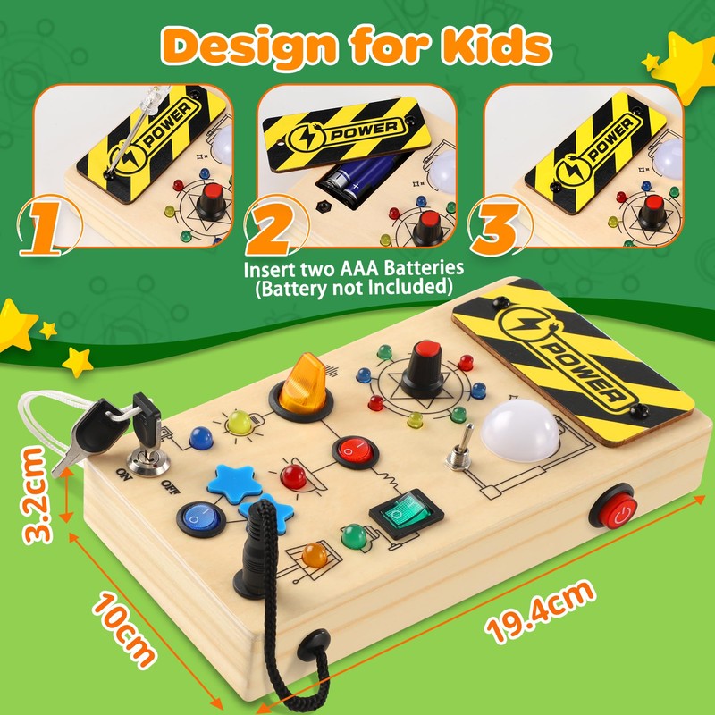 - Montessori Busy Board: Das Montessori Aktivitätsbrett verfügt über 9 verschiedene Schalter und 16 LED, einschließlich eines Hauptschalters, der nicht nur den Spaß erhöht, sondern auch den Eltern Zeit spart, das Spielzeug aufzuräumen. Mit diesem sensorischen Brett können Kinder stundenlangen Spaß haben. Das Holzbrett benötigt 2 AAA-Batterien (nicht im Spielzeugset enthalten)