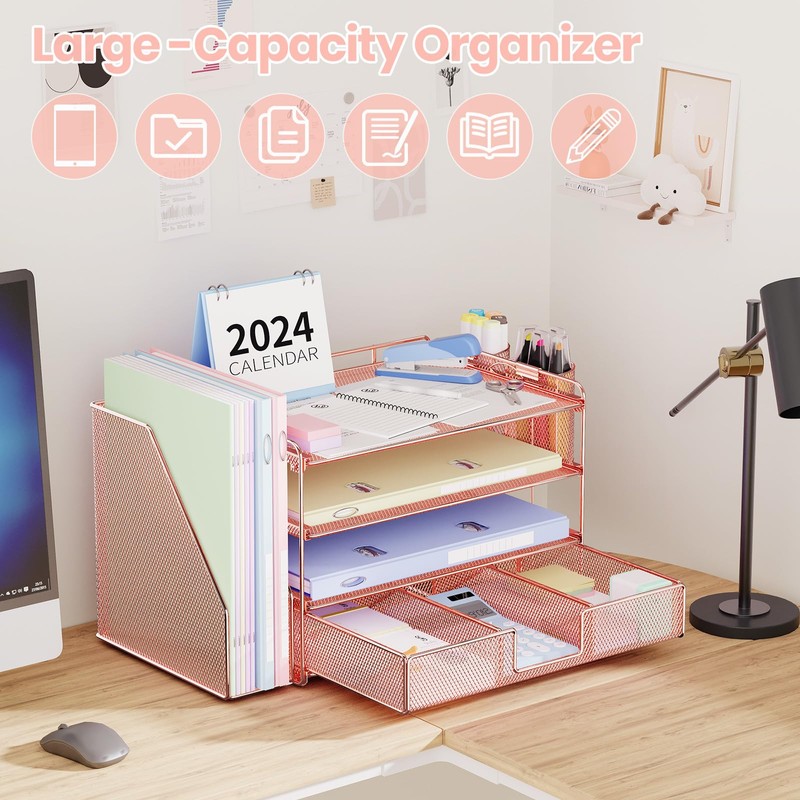 - Multi-Functional Office OrganizationGet your work area in order with the OPNICE Desk Organizer! Featuring 4 spacious trays, a vertical file organizer, 2 convenient hanging pen holders, and a sliding drawer, you can store all your office supplies, classify and organize them, and keep your desktop tidy