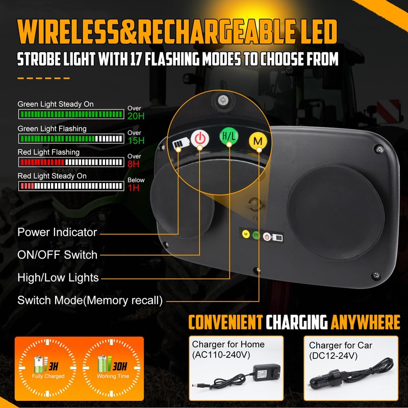 • 【Wireless Rechargeable Strobe Light Bar】Wireless rechargeable warning light bar built in powerful battery to run 14-30 hours.Easy to switch between 17 flashing modes.with Hi/Lo brightness.Equipped with two charger adapter for home and car.Ensuring you can recharge the light at anytime and anywhere.More convenient.