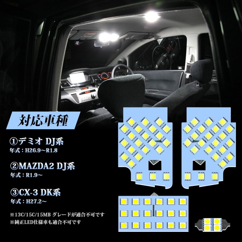 - Product information: LED room lamp set [Compatible models]: Mazda 2 Model: 6BA, 3BA DJLFS Year: R1.9 and up, Demio DJ Model: DJ3AS/DJ3FS/DJ5AS/DJ5FS/DJLFS/DJLAS Year: H26.9-R1.8 *Not compatible with 13C grade. [Luminous color] White 6000K Room Lamp Set Contents: Front 2 x room lamps, 1 x real-room lamp, 1 x luggage lamp, 4 x total