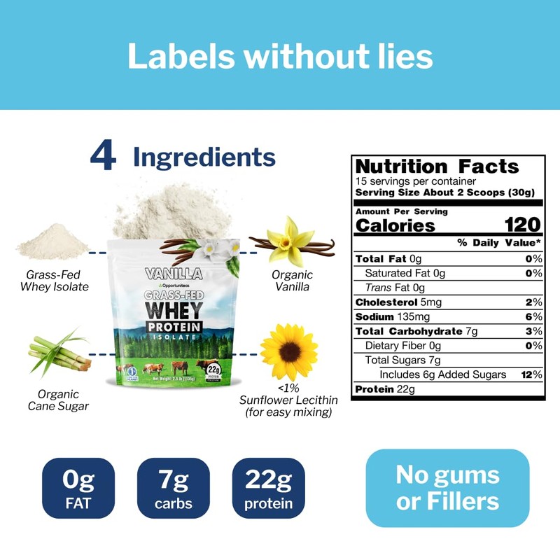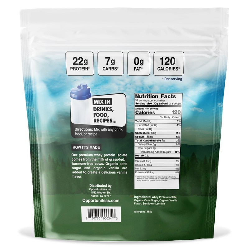 Opportuniteas Grass Fed Vanilla Whey Protein Isolate Powder - 22g Protein Powder Without Artificial Sweeteners, Hormone-Free Cows, Non GMO - 2.5lb