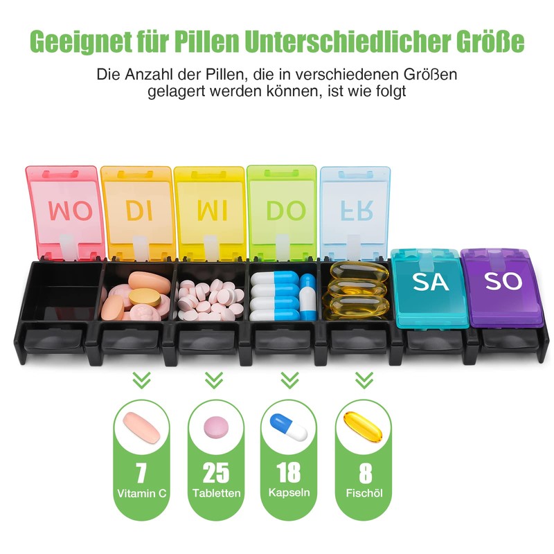 - 【Easy to use】Available in 7 compartments and with printed weekly abbreviations.