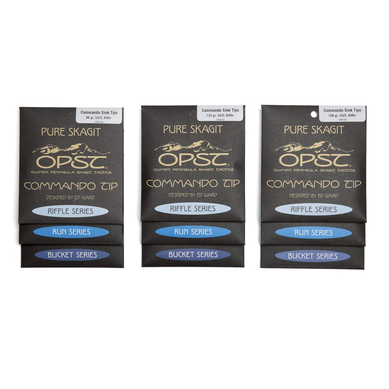 OPST now offers Commando Tips, completing your Pure Skagit system from hook to reel. Presenting your fly at the depth where fish are holding is one of the most important factors in successful fishing. Commando Tips are ideal for making swung fly presentations to steelhead and salmon. It's a fact that not every run calls for the fastest, heaviest sink tip. Riffles and shallower runs can be just as important as deep holes, especially in high water. In such conditions, a shallower, yet still level, sink is the way to go. Commando Tips will make you a more complete angler by allowing you to choose, within a set grain weight, from between three different sink rates: Riffle, Run and Bucket, for shallow, medium and deep water, respectively. Our tips are 12 feet long to enhance water load and prevent blown anchors, and come with strong welded loops at both ends for easy rigging. The rear ends come with color-coded line IDs to identify both grain weight and sink rate. 96 Grains are looped with Yellow, 132 grains with Light Blue, and 168 Grains are Tan. Within those three grain weights are the three sink rates (Riffle, Run, and Bucket) for each weight