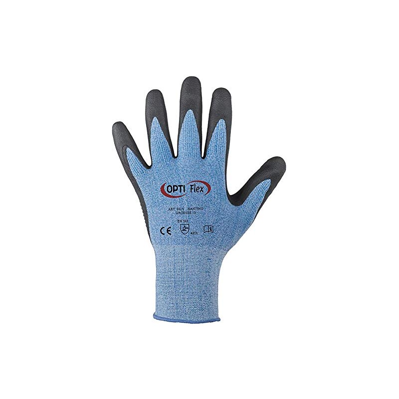 - Opti Flex Norm: EN 388 straps: 90% Polyester, 10% elastane (Lycra), Blue Coating: Micro Nitrile Foam with knobs, Black excellent fit; Very comfortable to wear, a great sense of touch, very good resistance to oils and fats Premium Quality fine-knit, seamless/15 g Secure Grip even of smooth objects spill-proof one pair in poly bag