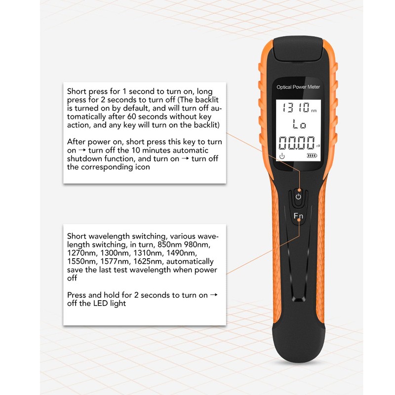 - 【MULTIFUNCTIONAL FIBER OPTIC TOOL】This fiber power meter supports functions such as lighting, automatic shutdown, memory wavelength, working frequency recognition, user calibration and more. In addition, it adopts a built in detector, which can be well protected, will not be damaged easily, ensuring long term test accuracy.