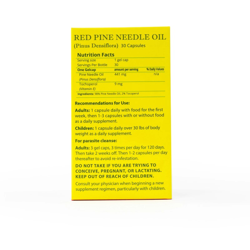 Ingredients: 98% Wild-Crafted Red Pine Needle Oil, 2% Vitamin E Oil.