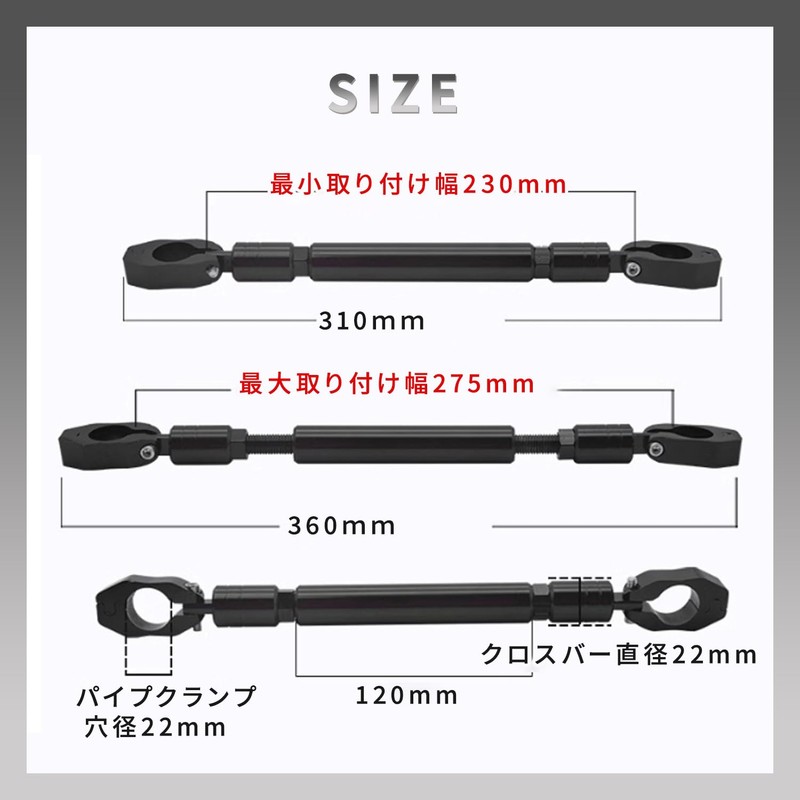 - Handle brace set, wrench included, 0.9 inch (22 mm) mounting diameter, adjustment range: 10.2 - 12.2 inches (260 - 310 mm), weight 8.5 oz (240 g), made of aluminum alloy. Easy to install and improves the maneuverability of your bike
